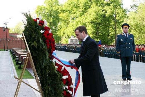 俄羅斯新任總統(tǒng)梅德韋杰夫來到克里姆林宮西北側(cè)紅墻下的亞歷山大花園,向無名烈士墓敬獻(xiàn)花圈,紀(jì)念衛(wèi)國戰(zhàn)爭勝利63周年。這是梅德韋杰夫就任總統(tǒng)后的首場正式活動。中新社發(fā) 田冰 攝