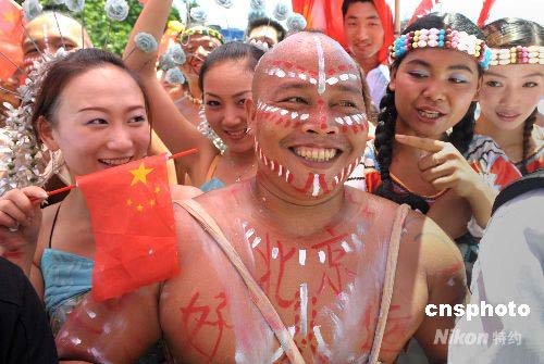 圖為世界之窗的外國演員在道旁歡呼圣火傳遞。 中新社發(fā) 廖攀 攝
