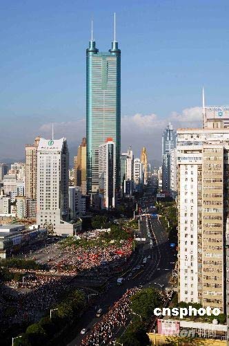 圖為火炬?zhèn)鬟f隊(duì)伍途經(jīng)深圳標(biāo)志建筑地王大廈。中新社發(fā) 陳文 攝