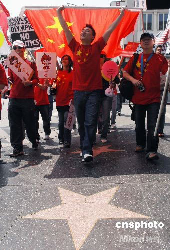 通過網(wǎng)絡(luò)自發(fā)組織的南加州數(shù)百名華人華僑、留學(xué)生在洛杉磯著名的好萊塢星光大道上舉行支持北京奧運(yùn)集會游行活動。中新社發(fā) 張煒 攝