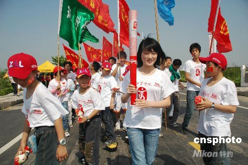 5月10日,模擬火炬?zhèn)鬟f途中。當(dāng)天,安徽師范大學(xué)舉辦“奧運(yùn)心,中華情”模擬奧運(yùn)火炬?zhèn)鬟f活動(dòng),主辦方邀請(qǐng)了學(xué)生、教師、老人、殘疾人等30人組成火炬手,體驗(yàn)奧運(yùn)火炬手的光榮與快樂(lè),表達(dá)對(duì)北京奧運(yùn)會(huì)的美好祝福。 中新社發(fā) 閔澤未 攝