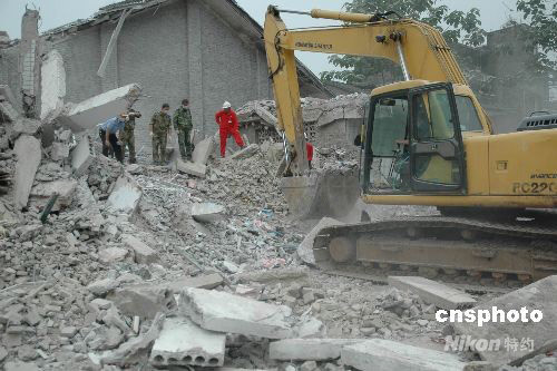 12日下午2:30左右,受四川汶川地震波及,重慶市梁平縣文化鎮(zhèn)一小學(xué)教學(xué)樓發(fā)生垮塌。13日凌晨1時許,搜救工作已全部結(jié)束,垮塌造成5人死亡,36人受傷。圖為挖掘機正在垮塌小學(xué)廢墟上進行挖掘。 中新社發(fā) 郭虹 攝