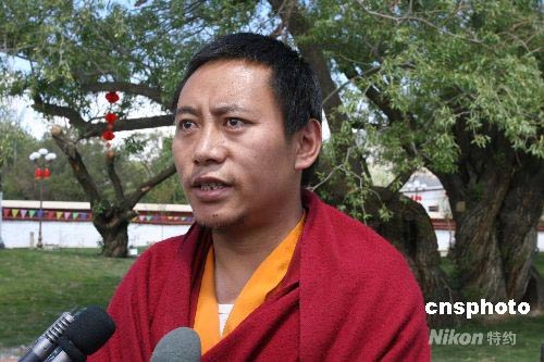 四川汶川大地震發(fā)生后,引起西藏宗教界極大關(guān)注,5月13日,拉薩哲蚌寺部分僧人代表在參觀完“三·一四”暴力事件中被燒毀的拉薩市第二中學(xué)教學(xué)樓、被毀店鋪和新改近造完工的羅布林卡廣場等處后表示,明天該寺將舉行主題祈福法會,為四川汶川地震災(zāi)區(qū)民眾祈福。圖為僧人平措塔青在祝福災(zāi)區(qū)民眾。中新社發(fā) 柳俊武 攝