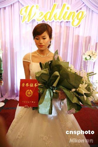 5月16日晚,在南京金陵飯店鐘山廳舉行了一場(chǎng)特殊的婚禮。當(dāng)身披婚紗的新娘踏上紅毯時(shí),應(yīng)該站在紅毯另一端的新郎--南京空軍某部飛行員饒新,卻正在千里之外的四川災(zāi)區(qū)執(zhí)行救援任務(wù)。這場(chǎng)只有新娘出席的婚禮感動(dòng)了整個(gè)南京城。中新社發(fā) 鐘山 攝