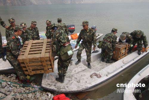 解放軍和武警官兵在搬運(yùn)沖鋒舟上的救災(zāi)物資。中新社發(fā) 郭國權(quán) 攝
