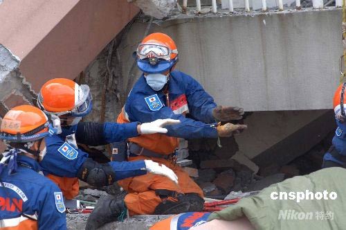 5月18日,日本國際救援隊(duì)一行二十余人到達(dá)中國四川北川地震現(xiàn)場——北川中學(xué),利用國際先進(jìn)的探測儀器與中國兩支救援隊(duì)分別挖掘廢墟,救援受難學(xué)生。經(jīng)過共同探測,在沉入地下的樓層內(nèi)發(fā)現(xiàn)有三個(gè)生物體存在,但挖掘極為危險(xiǎn)和困難,生者生命渺茫。圖為日本小隊(duì)在工作中。中新社發(fā) 鄒憲 攝