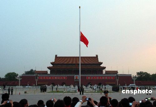 5月19日清晨,北京天安門(mén)廣場(chǎng)下半旗,哀悼5·12汶川大地震中遇難同胞。中國(guó)國(guó)務(wù)院作出決定,5月19日至21日為全國(guó)哀悼日。在此期間,全國(guó)和各駐外機(jī)構(gòu)下半旗志哀,停止公共娛樂(lè)活動(dòng),中國(guó)外交部和中國(guó)駐外使領(lǐng)館設(shè)立吊唁簿。5月19日14時(shí)28分起,全國(guó)人民默哀3分鐘,屆時(shí)汽車(chē)、火車(chē)、艦船鳴笛,防空警報(bào)鳴響。 中新社發(fā) 富田 攝