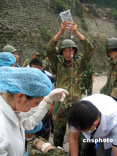 16日上午,師政治部主任高鵬帶領(lǐng)救援突擊隊(duì)和醫(yī)療小分隊(duì)172人,從綿竹市漢旺鎮(zhèn)出發(fā)向重災(zāi)區(qū)天池鄉(xiāng)幾個村里運(yùn)送救援物資,幫助群眾撤離震區(qū)。11時左右,當(dāng)部隊(duì)行至高橋以西500米處,突然發(fā)生余震,導(dǎo)致大量山石從山頂傾斜而下,直接威脅著正在這個路段通過的群眾。作訓(xùn)參謀祝紅杰突然發(fā)現(xiàn)一個孩子癱倒在石堆上,急忙上前搶抱他,孩子得救了,祝紅杰卻被亂石砸斷左腿,當(dāng)場倒地。作訓(xùn)參謀胡國才眼見一塊亂石砸向老人,極力將老人推到一邊,自己的頭部卻被亂石砸傷暈倒在地。同時,該團(tuán)還有一名司務(wù)長和兩名戰(zhàn)士在救援中被泥石流砸傷…… 看到解放軍為救災(zāi)區(qū)群眾身負(fù)重傷,在現(xiàn)場的一些救災(zāi)志愿者迅即投入搶救部隊(duì)官兵的行動中。運(yùn)送途中山路險峻,他們拉一把、推一把,爭先恐后出把力氣。擔(dān)負(fù)救援撤離群眾任務(wù)的重慶市高新區(qū)人民醫(yī)院的醫(yī)護(hù)人員聞訊后,一邊流著熱淚,一邊實(shí)施現(xiàn)場救護(hù),為他們贏得了寶貴的救治時機(jī)……