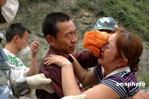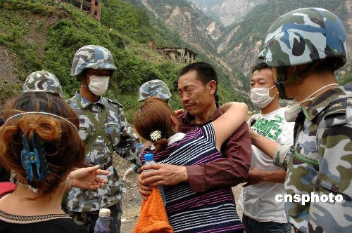 5月19日上午,100多名海軍陸戰(zhàn)隊(duì)員深入險(xiǎn)境,克服重重險(xiǎn)阻,將被困深山7天的礦工黃云躍解救出來,與妻子相見。夫妻重逢后相擁痛哭。李唐 攝