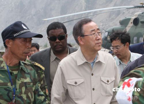 聯(lián)合國秘書長潘基文在映秀鎮(zhèn)察看地震災(zāi)情
