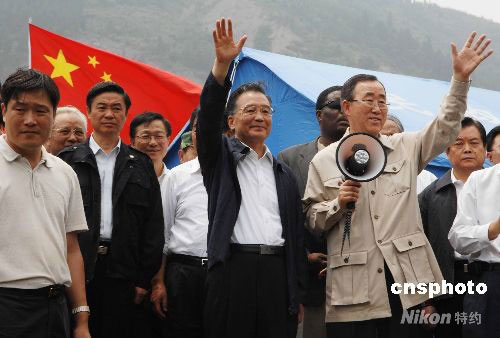 圖:溫家寶與聯(lián)合國(guó)秘書長(zhǎng)潘基文在映秀會(huì)面