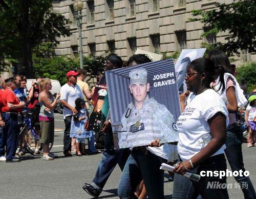 一些反戰(zhàn)組織也舉行了反戰(zhàn)示威,他們高舉在伊拉克戰(zhàn)場上陣亡的士兵畫像,要求布什政府盡快撤軍。中新社發(fā) 邱江波 攝