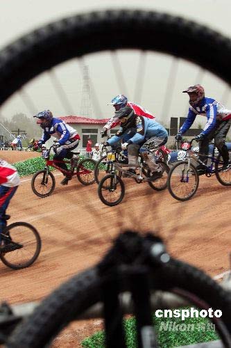 2008國際自行車聯(lián)盟BMX(小輪車)世界錦標(biāo)賽將于5月28日晚在山西省太原市拉開戰(zhàn)幕。33個國家的870多名運(yùn)動員參加此次比賽。5月27日上午,先期到達(dá)的國外運(yùn)動員抓緊時機(jī),熟悉場地。中新社發(fā) 張?jiān)?攝