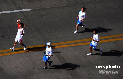 圖為第57號火炬手在傳遞火炬。中新社發(fā) 廖攀 攝