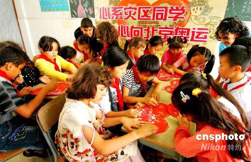 5月29日上午,浙江義烏群星學(xué)校舉行“心系災(zāi)區(qū)學(xué)生 心向北京奧運(yùn)” 慶“六一” 活動(dòng)。全校2300多名學(xué)生與147名外籍學(xué)生,在各自的心愿卡上寫(xiě)下祝福話語(yǔ),祝愿四川地震災(zāi)區(qū)小朋友“六一”快樂(lè),祝愿北京奧運(yùn)會(huì)圓滿(mǎn)成功。中新社發(fā) 張建成 攝