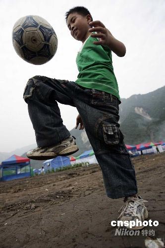 圖:什邡紅白鎮(zhèn)災(zāi)區(qū)的男孩在空地上踢球