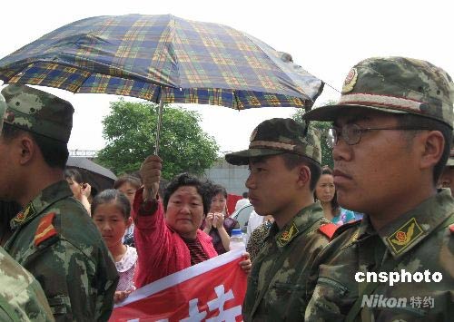 老大娘為參加唐家山堰塞湖搶險的武警官兵打傘