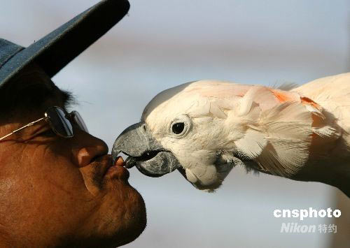 2008年6月1日,在山東西霞口神雕山野生動物園百鳥園內(nèi),一只鸚鵡從一位老人嘴中搶食,這種人、鳥和睦共處有趣的絕技表演,吸引著眾多游客前來觀賞。中新社發(fā) 郭光耀 攝