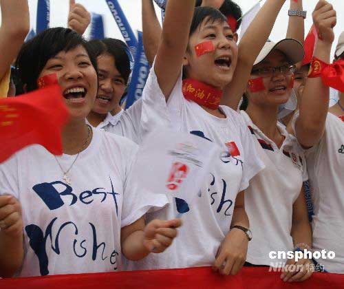 當?shù)孛癖娧赝緹崆闉榛鹁媸、北京奧運會加油。中新社發(fā) 林艷華 攝