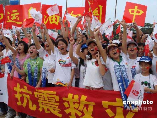 當?shù)孛癖娕e著國旗和奧運五環(huán)旗,高喊“中國加油”、“四川加油”。中新社發(fā) 黃艷梅 攝