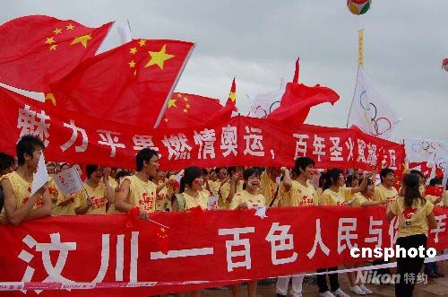 當(dāng)?shù)孛癖姛崆橛邮セ,并打出支持四川汶川地震?zāi)區(qū)人民的橫幅。中新社發(fā) 劉萬(wàn)強(qiáng) 攝