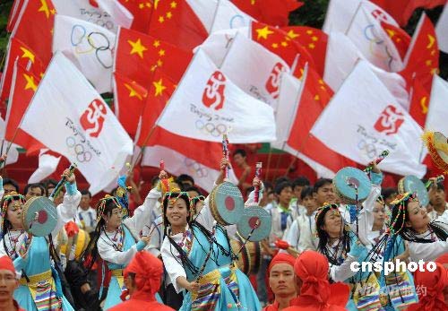 6月9日,奧運圣火開始在中國少數(shù)民族聚集地云南省開始傳遞,在昆明舉行的起跑儀式上藏族少女等少數(shù)民族青年載歌載舞歡慶圣火到來。 中新社發(fā) 廖攀 攝