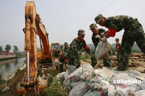 6月10日中午,四川省遂寧市遂寧軍分區(qū)、武警遂寧市支隊(duì)、遂寧消防組織的數(shù)百名參戰(zhàn)官兵正在加緊筑壩,以截?cái)嗵萍疑窖呷鬯魅胨鞂幨谐菂^(qū),保衛(wèi)遂寧40余萬人的生活飲用水源不被污染。當(dāng)天上午,據(jù)唐家山堰塞湖排險(xiǎn)水情測(cè)報(bào)指揮中心消息,唐家山堰塞湖泄流槽水勢(shì)較猛,下游水位增長較快。中新社發(fā) 鐘 敏 攝