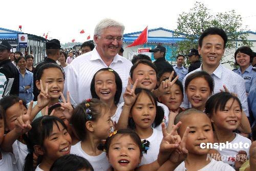德國(guó)副總理兼外長(zhǎng)施泰因邁爾來到四川地震災(zāi)區(qū)都江堰市“勤儉人家”安置點(diǎn),看望安置點(diǎn)的居民和帳篷學(xué)校的孩子們。圖為施泰因邁爾和孩子們合影留念。中新社發(fā) 黃榮 攝