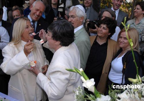 當(dāng)?shù)貢r(shí)間六月十六日下午五時(shí)零一分,美國(guó)加州貝弗利山的女同性戀者羅賓·泰勒和戴安·奧爾森(左),在洛杉磯縣政府大樓門前登記結(jié)婚。這是上個(gè)月加州高等法院裁決同性戀婚姻合法化后的洛杉磯縣第一對(duì)同性戀結(jié)婚者。當(dāng)?shù)孛襟w蜂擁而至,其中有三家電視臺(tái)同時(shí)進(jìn)行現(xiàn)場(chǎng)直播。中新社發(fā) 張煒 攝