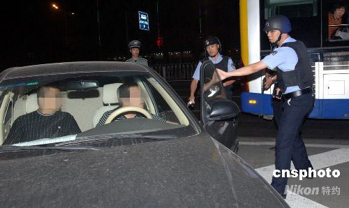 六月十九日夜,北京豐臺警方舉行奧運(yùn)安保演練,進(jìn)行設(shè)卡攔截演習(xí)。五十余輛警車迅速到達(dá)進(jìn)出北京方向和相關(guān)環(huán)線的各個(gè)路口執(zhí)行攔截任務(wù),并成功將“犯罪嫌疑人”截獲。中新社發(fā) 楊陽 攝