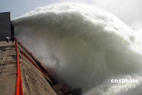 2008年6月23日,黃河小浪底水庫(kù)大流量下泄,再現(xiàn)飛瀑景觀。黃河第七次調(diào)水調(diào)沙2008年6月19日啟動(dòng)以來(lái),黃河小浪底水庫(kù)下泄流量逐步加大,通過(guò)小浪底水庫(kù)進(jìn)行人為控制,以水沙相協(xié)調(diào),對(duì)下游河道進(jìn)行沖刷,最終達(dá)到減少下游河道淤積的目的。中新社發(fā) 平白 攝