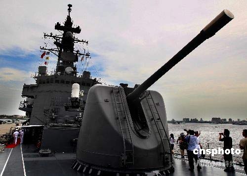 日本艦艇“漣”號(hào)到達(dá)湛江軍港后,中日記者應(yīng)邀到“漣”號(hào)上參觀采訪(fǎng)。中新社發(fā) 宋吉河 攝