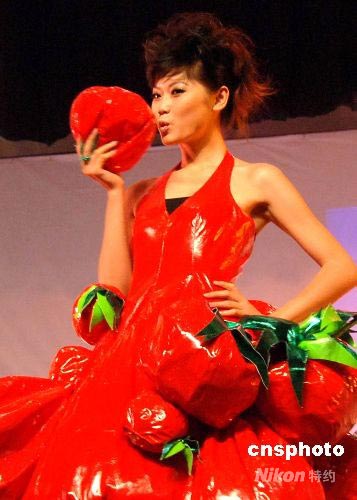 6月26日晚,閩江學(xué)院服裝與藝術(shù)工程系08屆畢業(yè)設(shè)計作品展演在福州舉行。圖為一名模特展示《西紅柿》服裝系列。中新社發(fā) 劉可耕 攝