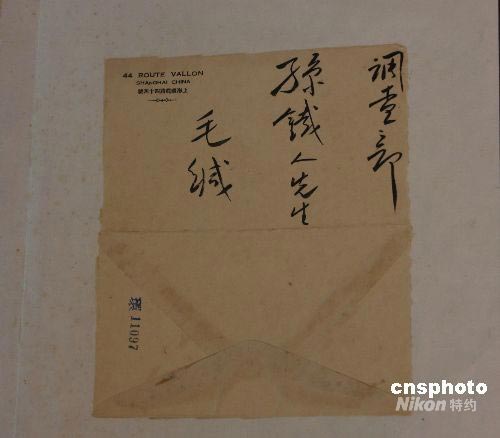 這是中國國民黨黨史館館藏的一九二四年毛澤東致平教委員會諸同志的一封親筆信的信封。中新社發(fā) 耿軍 攝