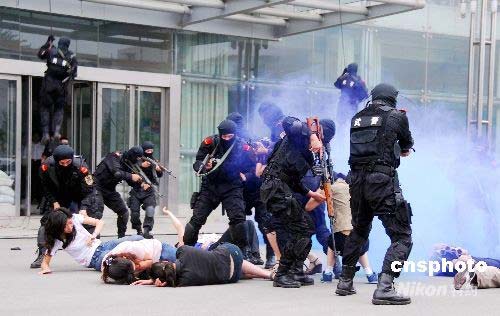 6月30日,山東省反恐怖工作協(xié)調(diào)小組在濟(jì)南成功舉行了“泰山2008”反恐演習(xí)。“泰山2008”反恐演習(xí)以北京奧運(yùn)會期間可能發(fā)生的恐怖襲擊事件為背景,以有效防范和正確處置為課題,主要目的是檢驗(yàn)和提升山東省城市防范處置恐怖襲擊事件的應(yīng)急反應(yīng)能力、組織指揮能力和綜合保障能力。這次演習(xí)是山東省第一次公安各警種與武警、衛(wèi)生、市政等反恐應(yīng)急力量協(xié)同作戰(zhàn)的合成演習(xí),是第一次以導(dǎo)調(diào)推演方式進(jìn)行的檢驗(yàn)性演習(xí),也是第一次通過全省公安視音頻系統(tǒng)同步傳輸?shù)姆纯盅萘?xí)。中新社發(fā) 陳 進(jìn) 攝