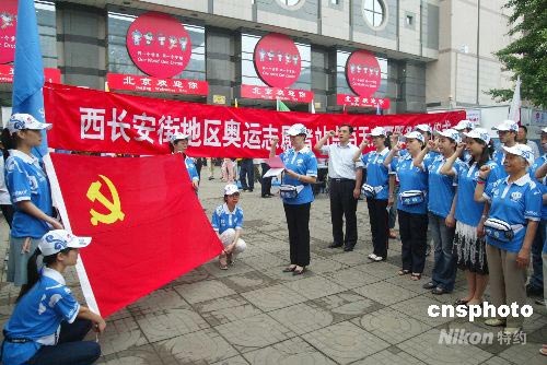 7月1日,中國(guó)共產(chǎn)黨成立87周年,黨員志愿者在黨旗下宣誓,將為北京奧運(yùn)會(huì)的成功舉辦奉獻(xiàn)自己的力量。中新社發(fā) 富田 攝