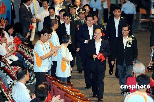 七月一日,香港回歸祖國十一周年紀(jì)念日,香港各界慶典委員會在香港體育館舉行盛大綜合文藝匯演,表達(dá)對汶川大地震災(zāi)后重建、慶祝香港回歸及北京奧運(yùn)的支持。特區(qū)行政長官曾蔭權(quán)、中聯(lián)辦主任高祀仁等嘉賓出席,并與現(xiàn)場數(shù)萬觀眾共同歡慶。中新社發(fā) 洪少葵 攝