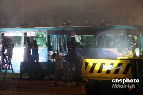 圖為重慶市刑警總隊官兵進行公共汽車反劫持演練。中新社發(fā) 周陽 攝