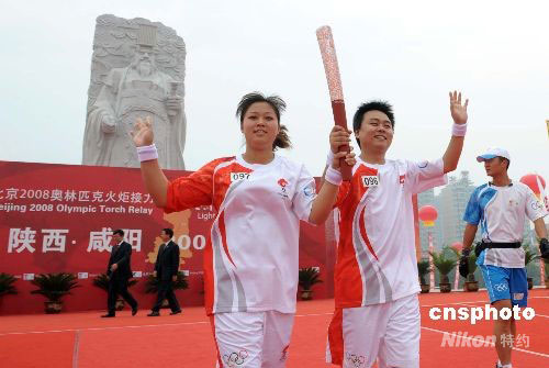7月3日下午,奧運(yùn)火炬在陜西咸陽傳遞,射擊運(yùn)動(dòng)員張波和射箭運(yùn)動(dòng)員張敏攜手從統(tǒng)一廣場(chǎng)的秦始皇雕像下跑出咸陽火炬?zhèn)鬟f第一棒。 中新社發(fā) 廖攀 攝