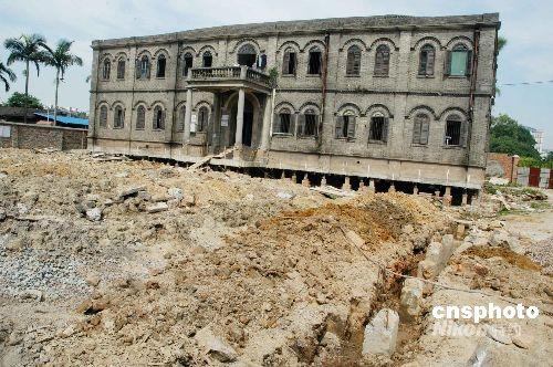 2008年7月3日,福州老洋房泛船浦教堂神父樓在上百個千斤頂?shù)闹蜗码x地1米,準備整體平移。這棟老洋房由于位于建設規(guī)劃范圍內(nèi),經(jīng)過一年多準備,福州市有關部門決定對泛船浦教堂神父樓實施整體平移,以利于文物保護和減少經(jīng)濟損失。這幢樓將先往東平移75.6米,再整體旋轉90度向南平移30.7米,由東西朝向變?yōu)槟媳背。該教堂建?932年秋,1933年9月落成,耗資17萬銀元,建筑風格屬半哥特式、半法國式。中新社發(fā) 張 斌 攝