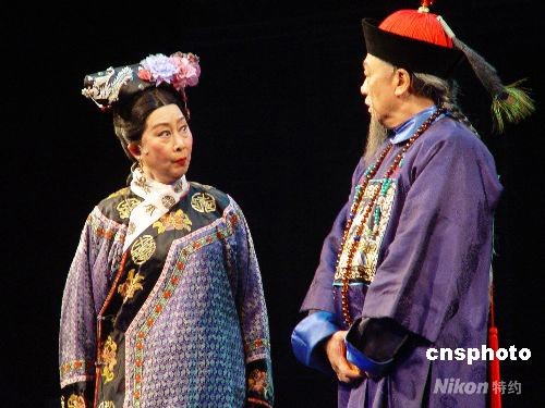 7月3日晚,香港話劇團(tuán)帶來的經(jīng)典話劇《德齡與慈禧》登陸北京國家大劇院。劇中慈禧由盧燕主演,年逾八旬的她曾在上世紀(jì)70年代贏得過三次臺灣金馬獎影后,并在《傾國傾城》、《瀛臺泣血》、《末代皇帝》和《德齡與慈禧》中四次扮演“慈禧”一角。劇中榮祿由香港鉆石級男配角曾江表演。他當(dāng)年在《射雕英雄傳》中扮演的“黃老邪”入木三分,至今讓內(nèi)地影迷津津樂道。圖為盧燕扮演的“慈禧”與曾江扮演的“榮祿”在戲中的對手戲,兩位老戲骨的表演讓人大呼過癮。中新社發(fā) 應(yīng)妮 攝