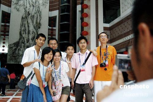 7月7日下午,參加海峽西岸2008年臺(tái)胞青年夏令營(yíng)的110多名臺(tái)胞青年來(lái)到位于古城泉州的中國(guó)閩臺(tái)緣博物館。圖為臺(tái)灣青年在閩臺(tái)緣鎮(zhèn)館之寶《同文同種同根生》世界面積最大火藥壁畫(huà)前合影留念。 中新社發(fā) 傅丹丹 攝