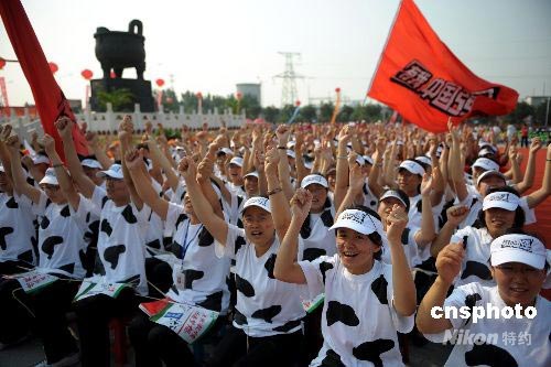 圖:內(nèi)蒙民眾身著奶牛服裝迎接奧運(yùn)火炬