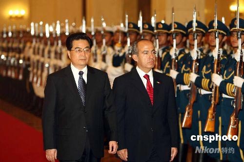 圖:胡錦濤歡迎墨西哥總統(tǒng)卡爾德龍?jiān)L華