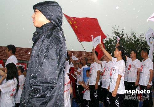圖:大慶石油工人冒雨為奧運(yùn)火炬?zhèn)鬟f吶喊助威