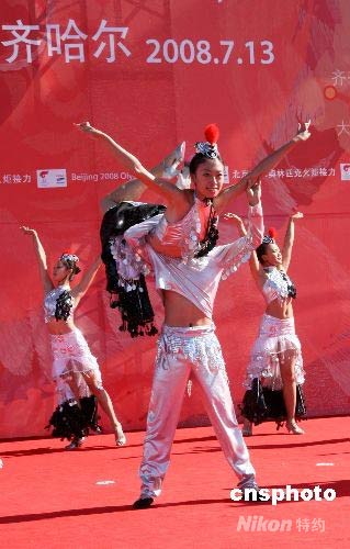 7月13日,北京奧運(yùn)火炬在“丹頂鶴之鄉(xiāng)”齊齊哈爾傳遞,當(dāng)?shù)匮輪T擺出仙鶴造型,以獨(dú)特風(fēng)情喜迎圣火。 中新社發(fā) 周兆軍 攝