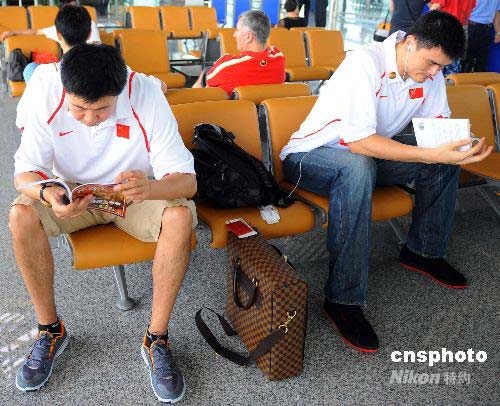 在北京機(jī)場候機(jī)時(shí),中國男籃的“擎天拄”姚明與王郅治看書消磨時(shí)光。中新社發(fā) 任晨鳴 攝