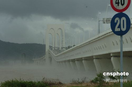 八月六日上午,受熱帶風暴“北冕”影響,澳門掛出八號風球,三座連接半島和離島的大橋橋面關(guān)閉,唯圖中西灣大橋的下層通道可供車輛使用。中新社發(fā) 畢永光 攝