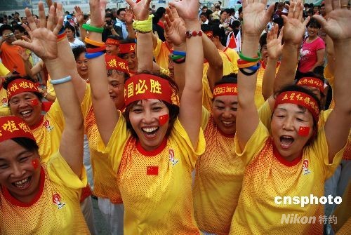 圖:北京群眾拉拉隊在天安門廣場為奧運加油