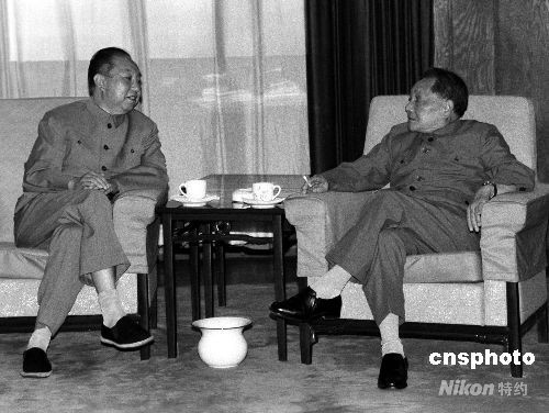 曾擔(dān)任中國(guó)共產(chǎn)黨和國(guó)家重要領(lǐng)導(dǎo)職務(wù)的華國(guó)鋒,因病醫(yī)治無(wú)效,于2008年8月20日12時(shí)52分在北京逝世,享年87歲。資料圖為1987年,鄧小平與華國(guó)鋒在出席全國(guó)人民代表大會(huì)全體會(huì)議期間在休息室交談。中新社發(fā) 呂相友 攝
